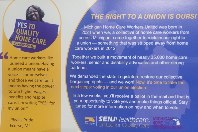 I've posted two previous stories on this subject: New legislation allows union to take percentage of Home Help worker pay last November and Huge door-to-door campaign underway to unionize Home Help workers in April. The door-to-door campaign is over with and the next step is an election to make Service Employees International Union the exclusive representative of Michigan's Home Help workers. Or not. According to a flyer distributed recently, SEIU thinks there is going to be an election. Ballots will be mailed soon, they say: