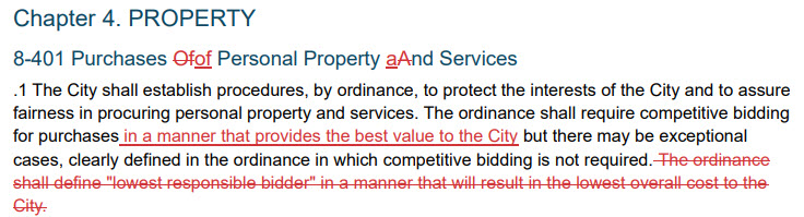 Under the new charter, when the City selects a bidder for a project or purchase, it will base its decision on who provides the "best value" rather than the lowest price, and that will be determined with a scoring system included in an ordinance passed by City Council in August. Here it is. As I said in my September 21 story, only 40 points out of 100 are for price. The other 60 are for non-monetary criteria. Twelve points are awarded for offering healthcare, retirement plans and prevailing wage.