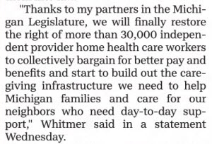 Whitmer's statement that home "health" workers would be able to collectively bargain for better pay and benefits was a lie. Payment amounts are set by the legislature. Public Act 144 seems to acknowledge this: