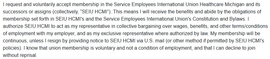 Note that it says membership is continuous "unless I resign by providing notice to SEIU HCMI via U.S. mail..." but it doesn't provide an address.